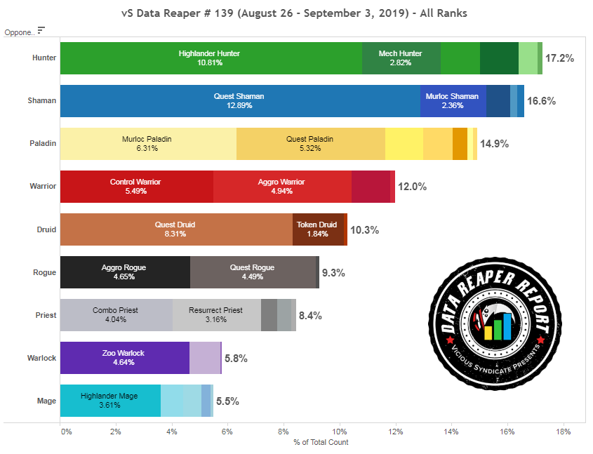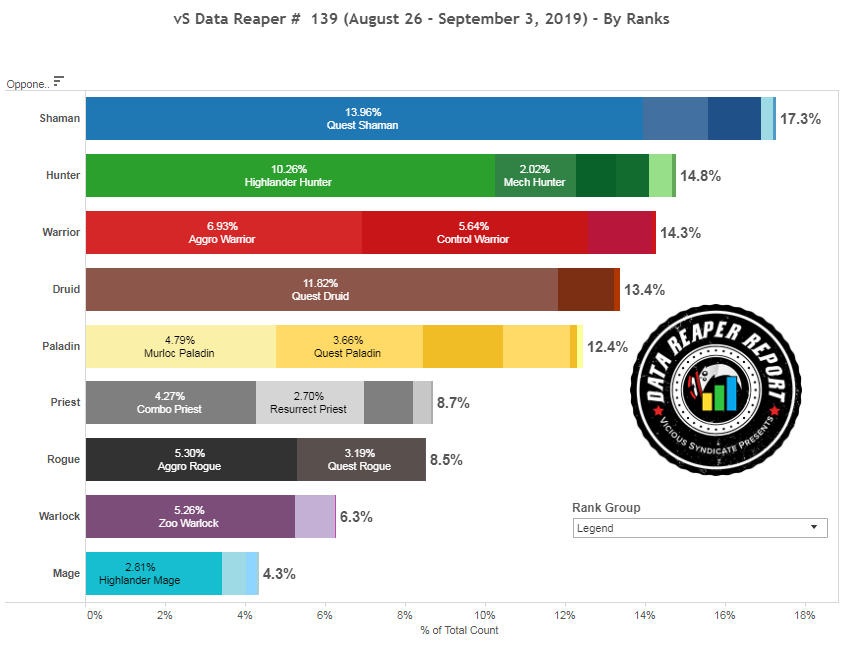 Когда в последний раз Шаман был самым распространенным классом в легенде или на любом другом ранге? Квест Шаман стал самой популярной квестовой колодой. Агрессивные колоды Шамана: Агро Шаман и Мурлок Шаман, также заметны, но в меньшем количестве.